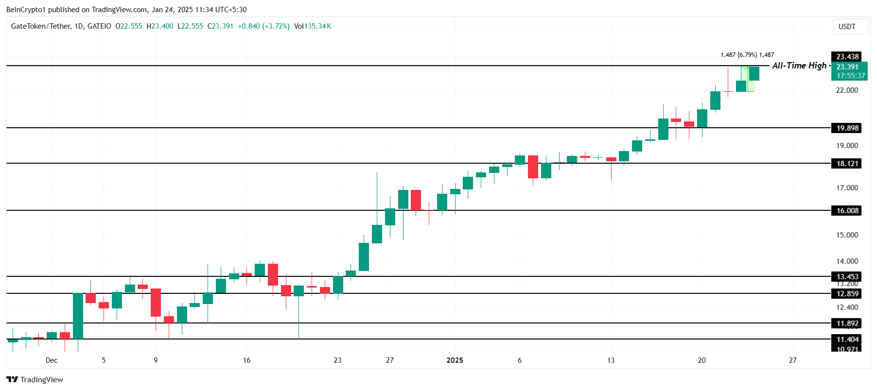 GT nådde en ny rekordnivå på 23,43 USD inom de senaste 24 timmarna innan den sjönk något till 23,39 USD. Denna prisrörelse visar stark momentum för altcoinet, med handlare som noga övervakar dess förmåga att hålla vinster nära dessa rekordnivåer.