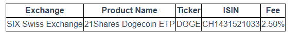 21Shares har listat en Dogecoin ETP (börshandlad produkt) på SIX Swiss Exchange under tickern “DOGE”.