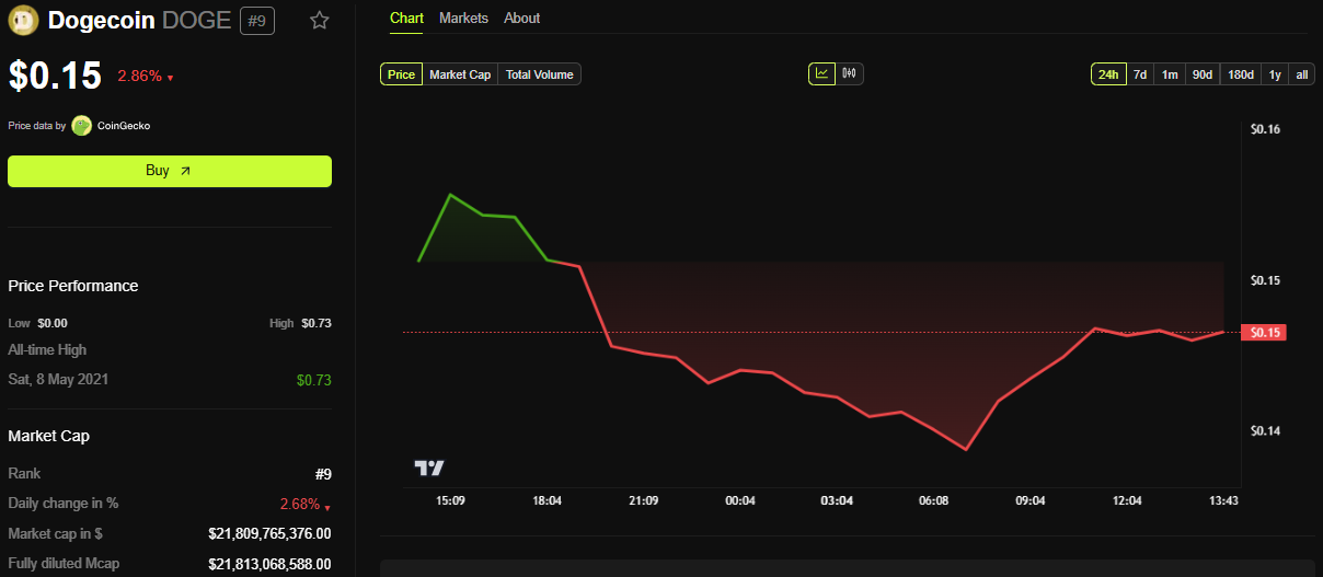 Trots denna nyhet har DOGE:s pris fallit nästan 3% de senaste 24 timmarna. I skrivande stund handlades DOGE för 0,15 USD, ned 0,6% den senaste timmen.