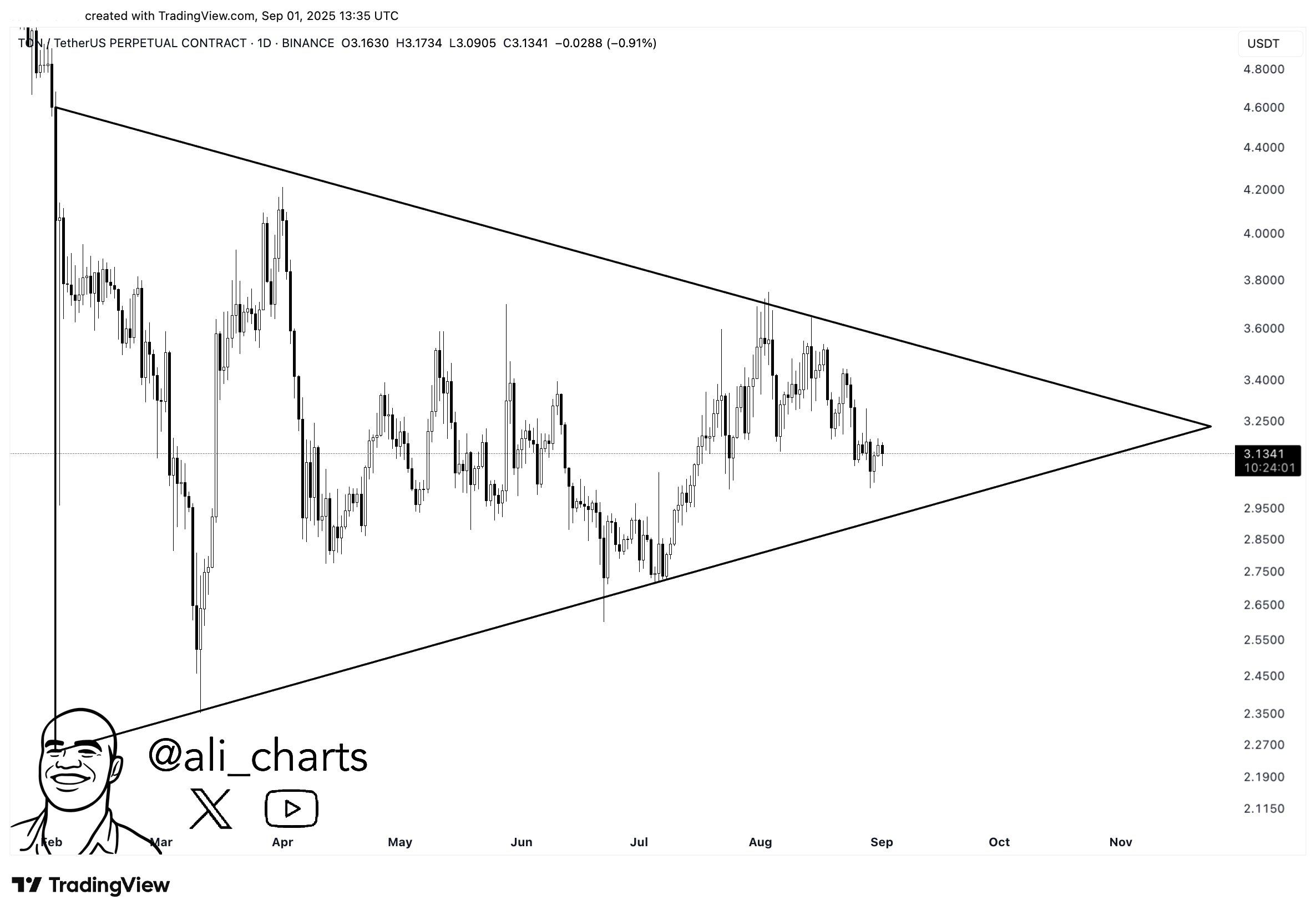Ur ett tekniskt perspektiv visar flera analyser att ton konsoliderar inom ett triangelmönster, ofta en föregångare till stora prisrörelser. Analytiker Ali noterar att om ett avgörande utbrott sker, kan priset svänga så mycket som 50 %.