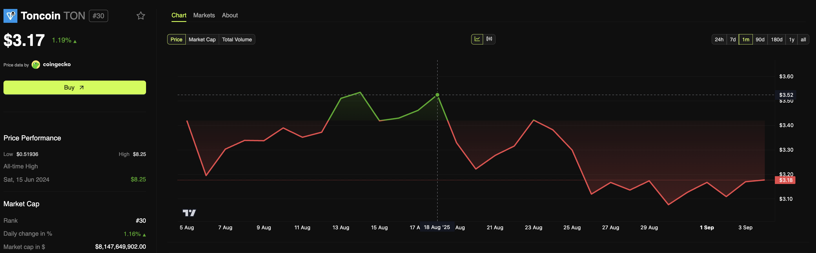 På marknadssidan handlas toncoin runt 3,1–3,4 USD, långt under sin senaste kortsiktiga topp. Vanligtvis hjälper framväxten av treasuryfonder och återköpsprogram till att minska det cirkulerande utbudet och stärka innehavskänslan, vilket kan stödja en potentiell uppgång om betydande handelsvolymer bekräftar det.