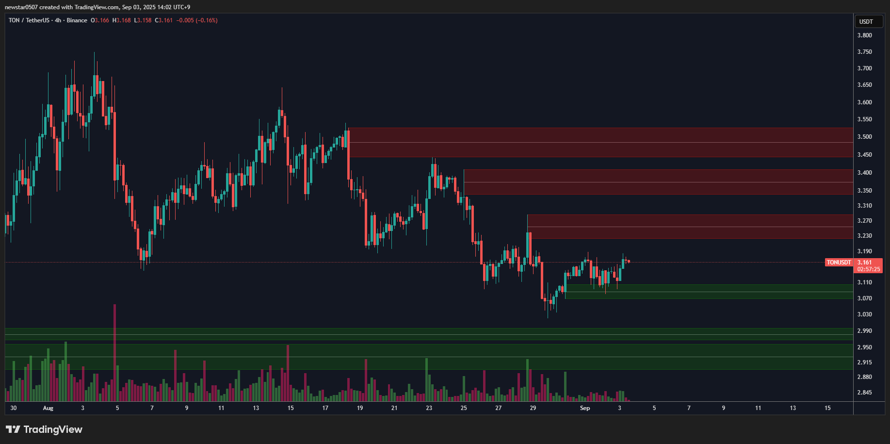 På kort sikt är utbuds- och efterfrågedynamiken tydlig: ton har upprepade gånger avvisats runt 3,4–3,45 USD-zonen, som allmänt ses som ett starkt utbudsområde. Utan tillräckligt köppress kan priset testa 3,00–3,27 USD-nivåerna innan det väljer sin nästa riktning. I ett mindre optimistiskt scenario kan ton till och med återgå mot 2,68 USD.