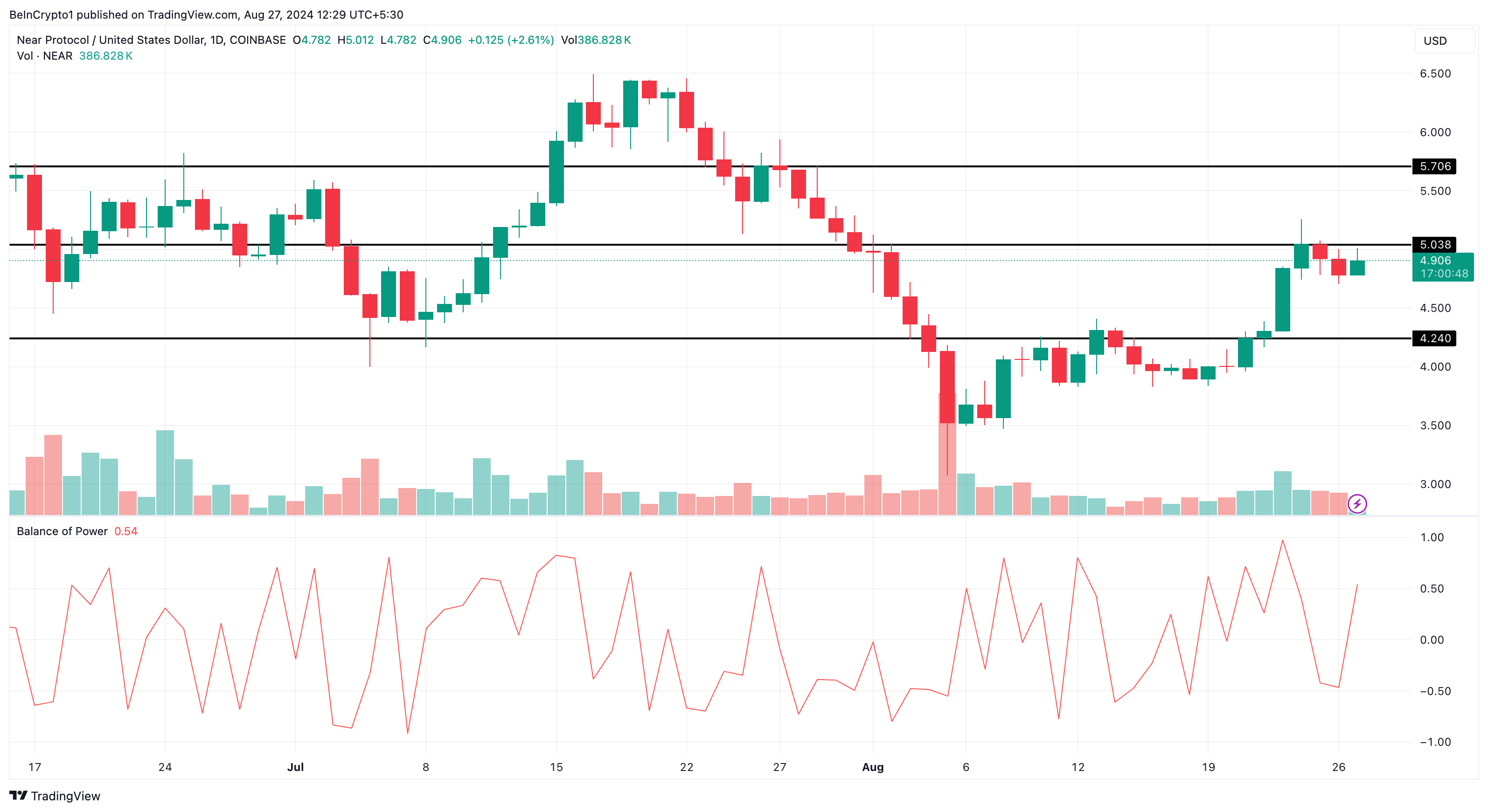 Tekniskt sett försökte NEAR bryta sig förbi 5,03 USD på måndagen men mötte motstånd och drog sig tillbaka till 4,91 USD. Dock tyder signaler från Balance of Power (BoP)-indikatorn på att detta motstånd kan övervinnas snart.