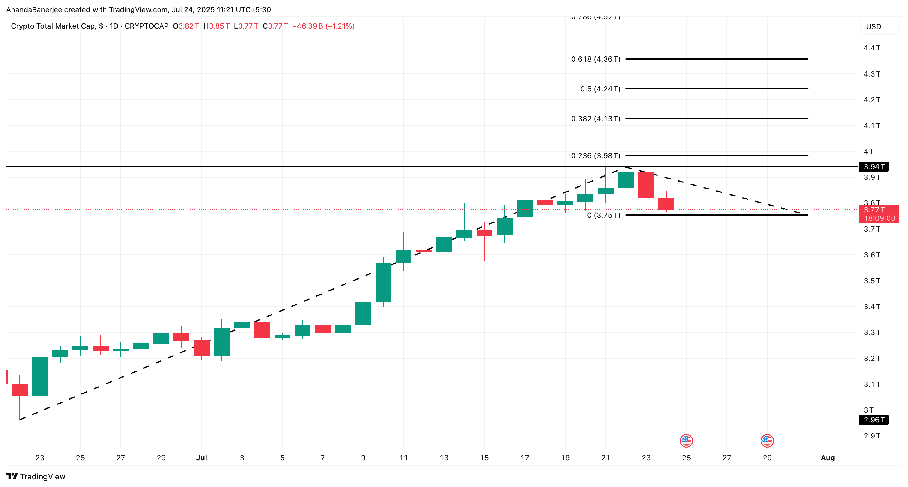 Det totala kryptomarknadsvärdet har tagit en rejäl smäll, korrigerar från den senaste toppen på 3,94 biljoner USD. För närvarande ligger det precis över det viktiga stödet på 3,75 biljoner USD. Ett fall under detta kan signalera en förlängd nedgångsrisk.