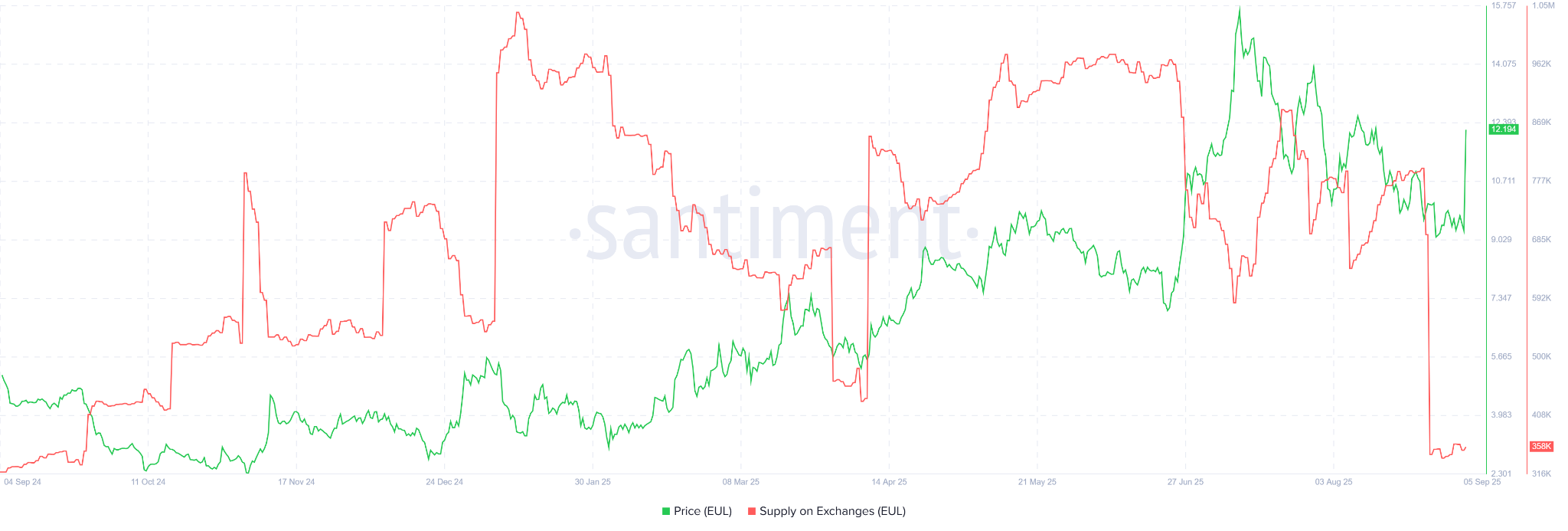 Santiment-data visar att Eulers (EUL) börsreserver sjönk till en ettårslägsta på 358 000 EUL i första veckan av september.
