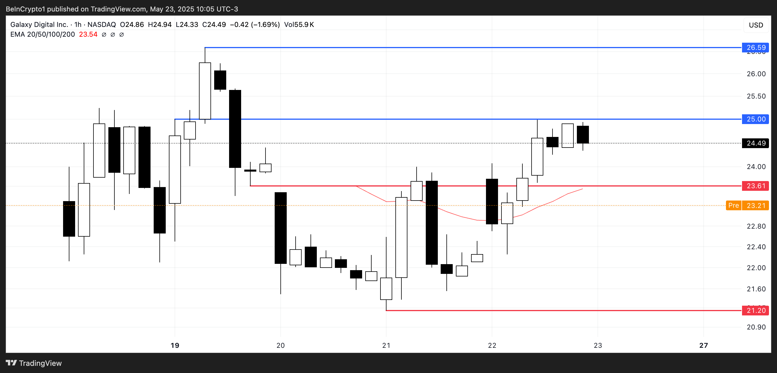 Åt andra hållet, om köparna återtar kontrollen, kan GLXY testa motståndet vid 25 USD och sikta på en rörelse mot 26,59 USD inom kort.