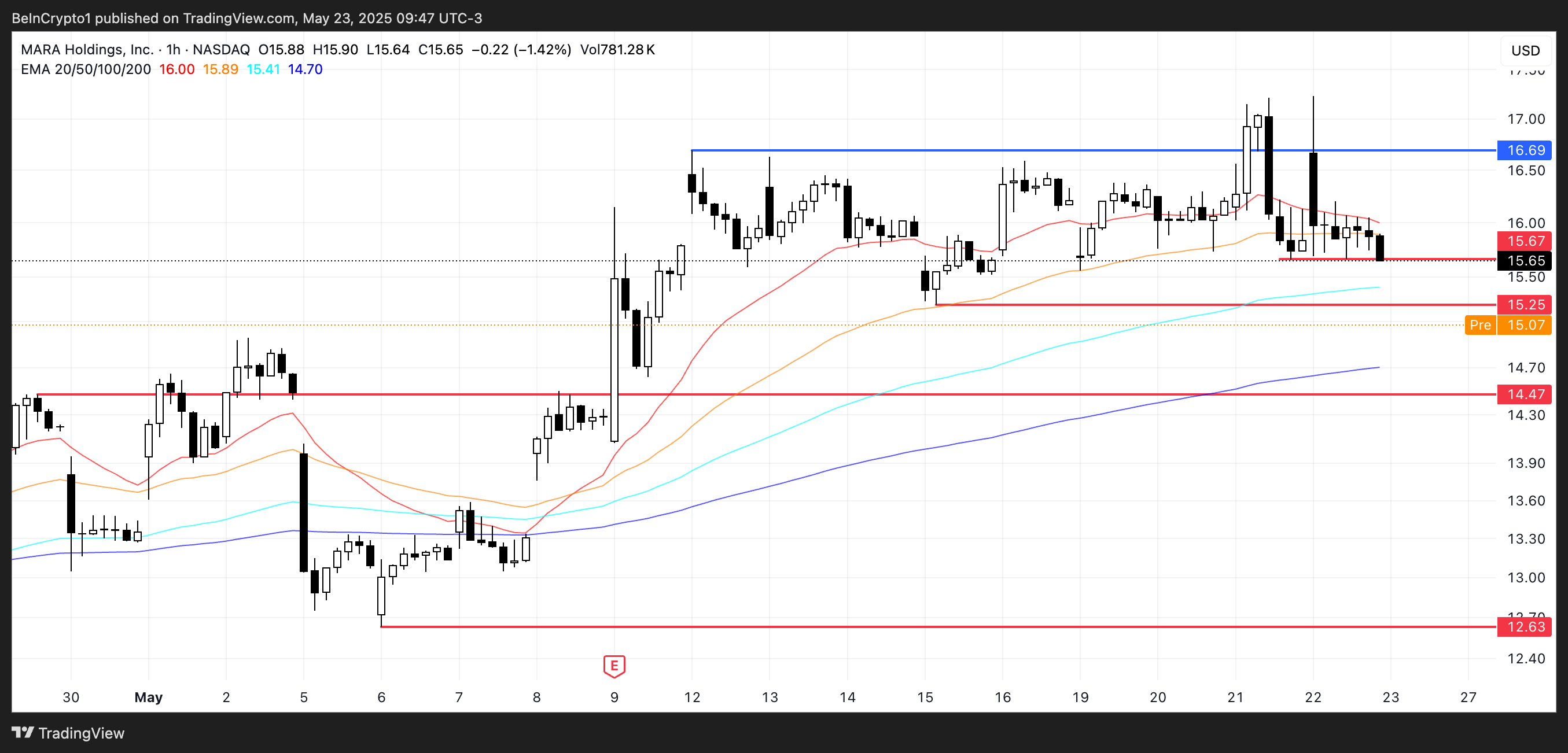 Om trenden försvagas ytterligare kan MARA testa stöd vid 15,67 USD och 15,25 USD; ett genombrott under dessa nivåer kan leda till en nedgång mot 14,47 USD.