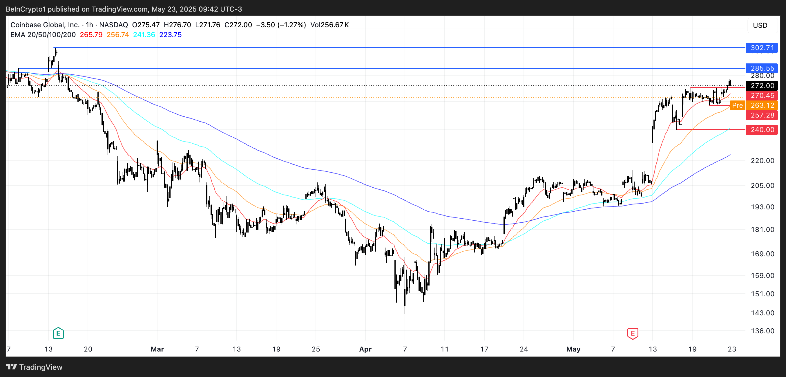 I förhandeln sjunker COIN med 3,8 %, vilket speglar Bitcoins nedgång efter Donald Trumps tillkännagivande av en potentiell 50 % tull på EU, vilket utlöste bredare riskaversion. Med COIN som svävar nära viktiga stödnivåer vid 270,45 USD och 257 USD, kan ett genombrott öppna vägen mot 240 USD.