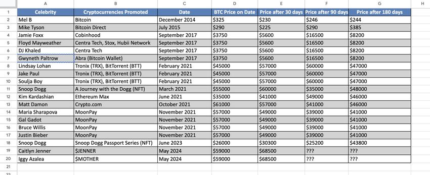 “Baserat på detta kan vi dra slutsatsen att när kändisar börjar marknadsföra kryptovalutor upplever marknaden vanligtvis ett sista ben upp innan den når en lokal topp. I vilket fall som helst är urvalsstorleken liten, och därför är kanten begränsad. Icke desto mindre är det intressant”, sade kryptoinfluencer – Capo of Crypto.