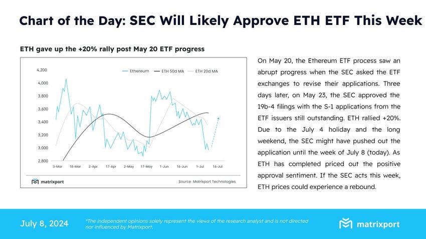 Tillsammans med den förväntade lanseringen räknar Matrixport-rapporten med en återhämtning på 12% för Ethereum-priset till 3 400 dollar. Dessa spekulationer kommer efter att ETH steg med 20% i maj efter godkännande av 19-b-ansökningar. Det hausseartade sentimentet från ett godkännande förväntas spilla över till Bitcoin, vilket stöder en återhämtning.