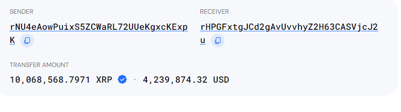 Dataplattformen Blockchair rapporterade en rad XRP-transaktioner på börser på måndagen. I en transaktion flyttades över 10 miljoner XRP-tokens till ett värde av minst 4,2 miljoner dollar från Binance till en okänd plånbok.