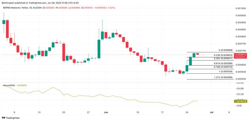 Prisuppgången backas upp av efterfrågan från marknadsaktörer. Avläsningar från BEPROs ackumulerings-/distributionsledning bekräftar detta. Den har stigit stadigt med tokens pris de senaste dagarna.