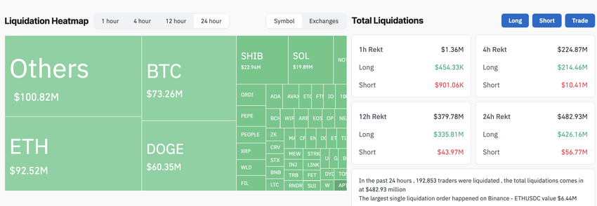Data från CoinGlass visade att Ethereum var den hårdast drabbade, med likvidationer på totalt 92,52 miljoner dollar. Det följdes av Bitcoin och Dogecoin (DOGE), med 73,26 miljoner dollar respektive 60,35 miljoner dollar i likvidationer.