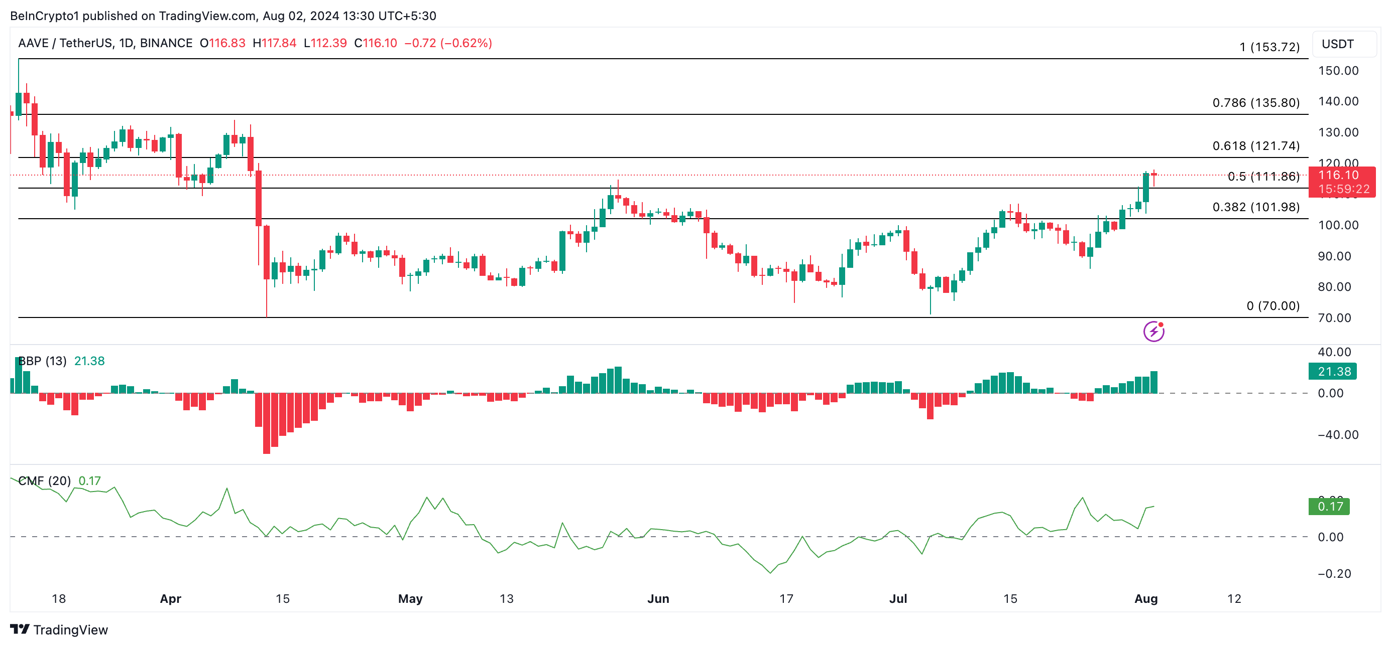 Priset på AAVE, styrningstokenen för det ledande utlåningsprotokollet Aave, har varit på en uppåtgående trend sedan den 5 juli. Den handlas för närvarande på $115,80 och har nått sin högsta nivå under de senaste tre månaderna.