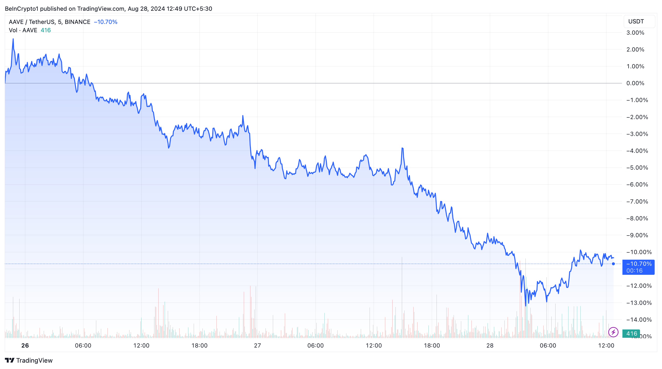 Trots ett lovande samarbetsförslag med BlackRock fortsätter Aaves token att minska denna vecka. Integrationsplanen, som involverar BlackRocks USD Institutionella Digitala Likviditetsfond (BUIDL) och Aaves plattform, har ännu inte haft en positiv inverkan på tokens kortvariga prestanda.