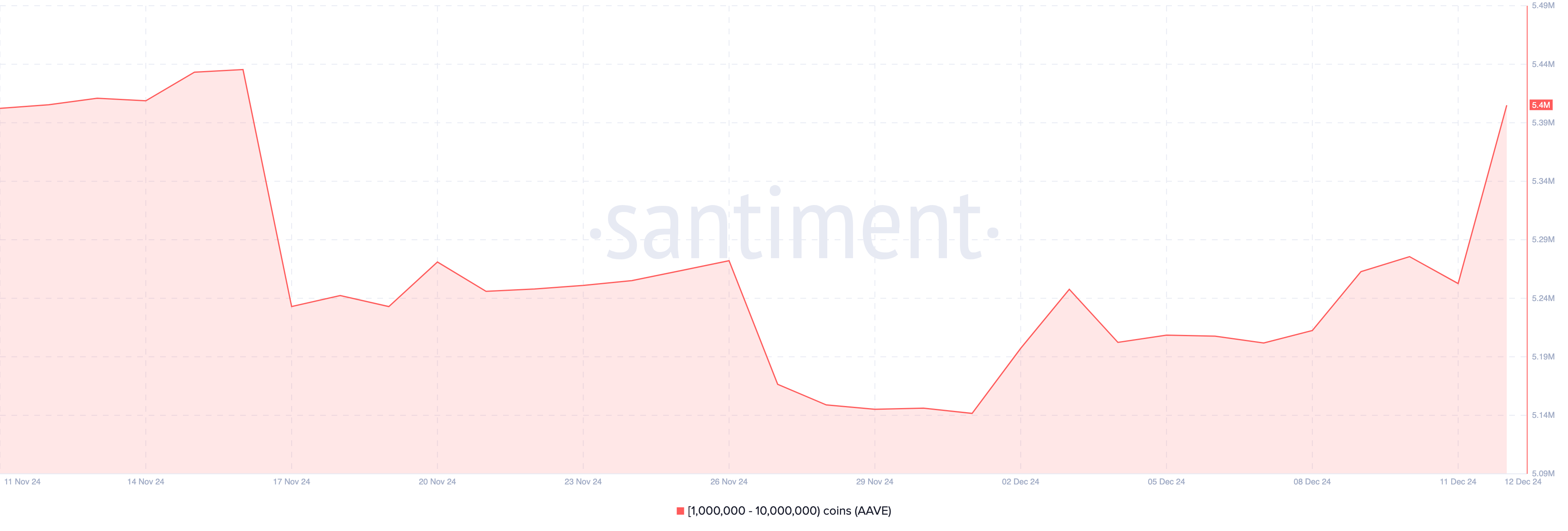 Vidare visar en titt på AAVE-saldot på adresser att kryptovalvalar inte har slutat köpa altcoin. Den 1 december var saldot i plånboken för AAVE-adresser som äger mellan 1 miljon och 10 miljoner tokens och 5,14 miljoner USD.