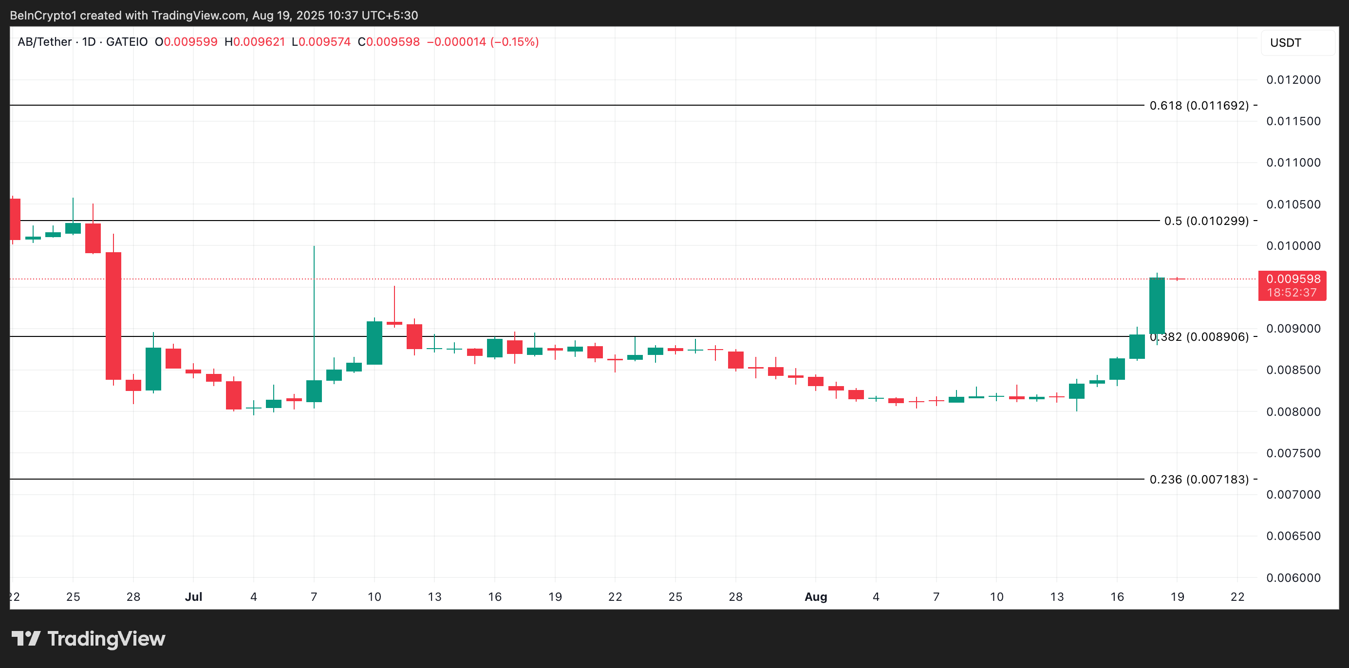 Hållbar efterfrågan på AB kan utlösa ett försök att bryta över det långsiktiga motståndet vid 0,0102 USD. Ett lyckat genombrott av denna barriär kan öppna dörren för en uppgång mot 0,116 USD.