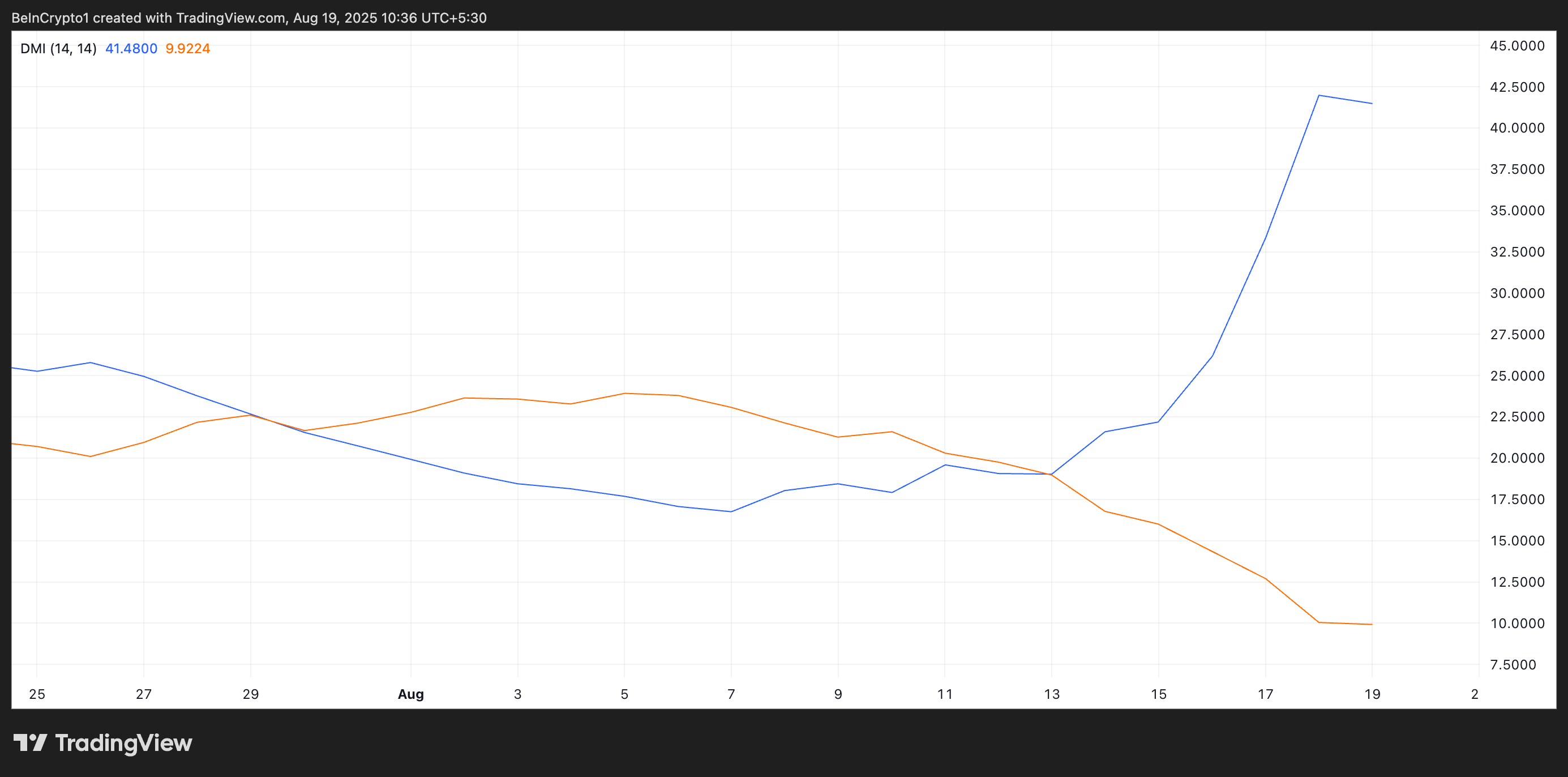 När en tillgångs +DI ligger över dess -DI, är uppåtgående prisrörelser starkare än nedåtgående, vilket indikerar en positiv trend. Den ökande klyftan mellan de två linjerna på AB/USD:s endagsdiagram bekräftar den starkare riktningen till förmån för köparna.