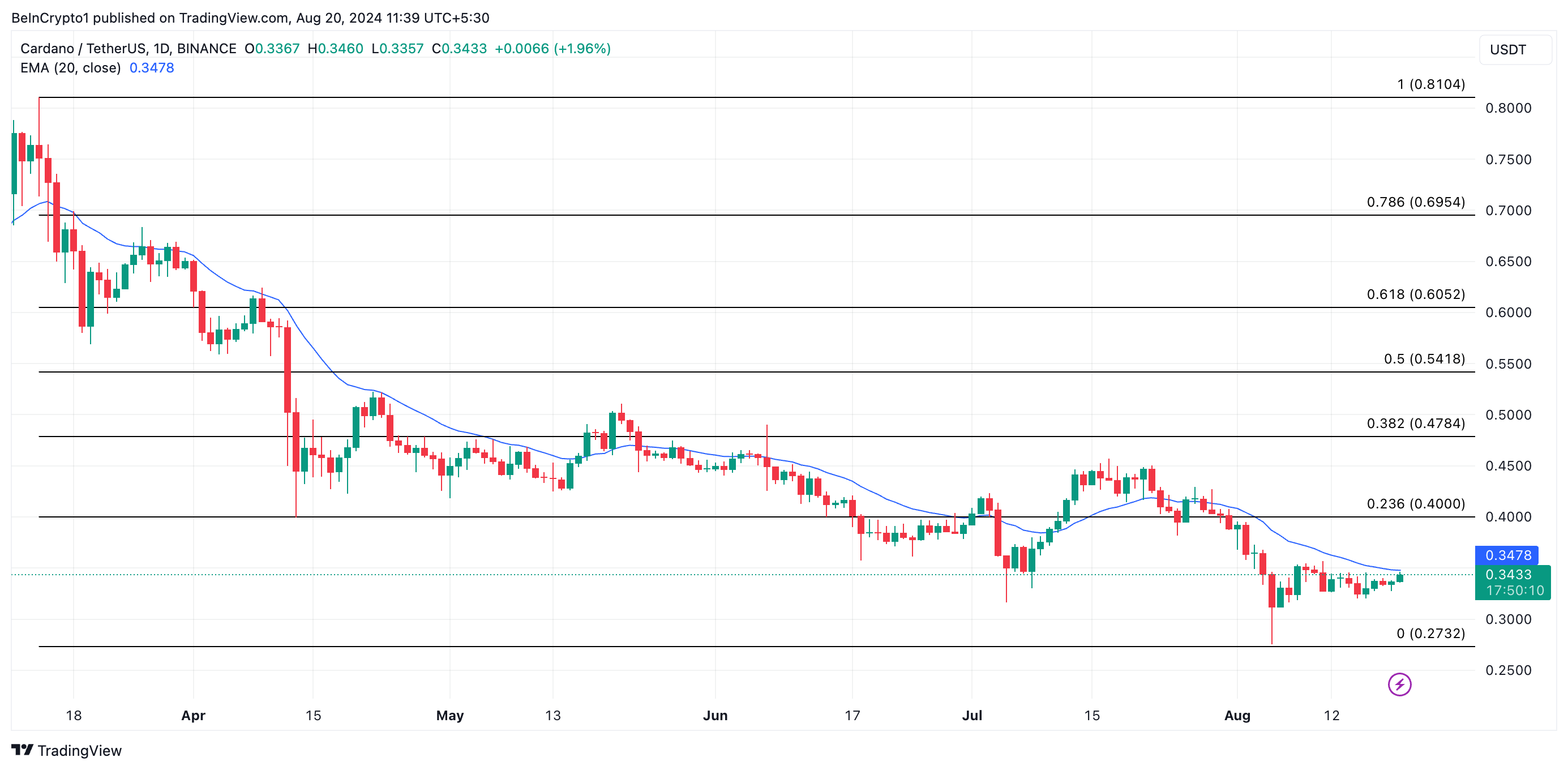 Enligt en analys på en dagsdiagram visar ADA:s rörelser att priset försöker korsa över dess 20-dagars exponentiella glidande medelvärde (EMA). Detta glidande medelvärde spårar en tillgångs genomsnittliga pris över de senaste 20 handelsdagarna.