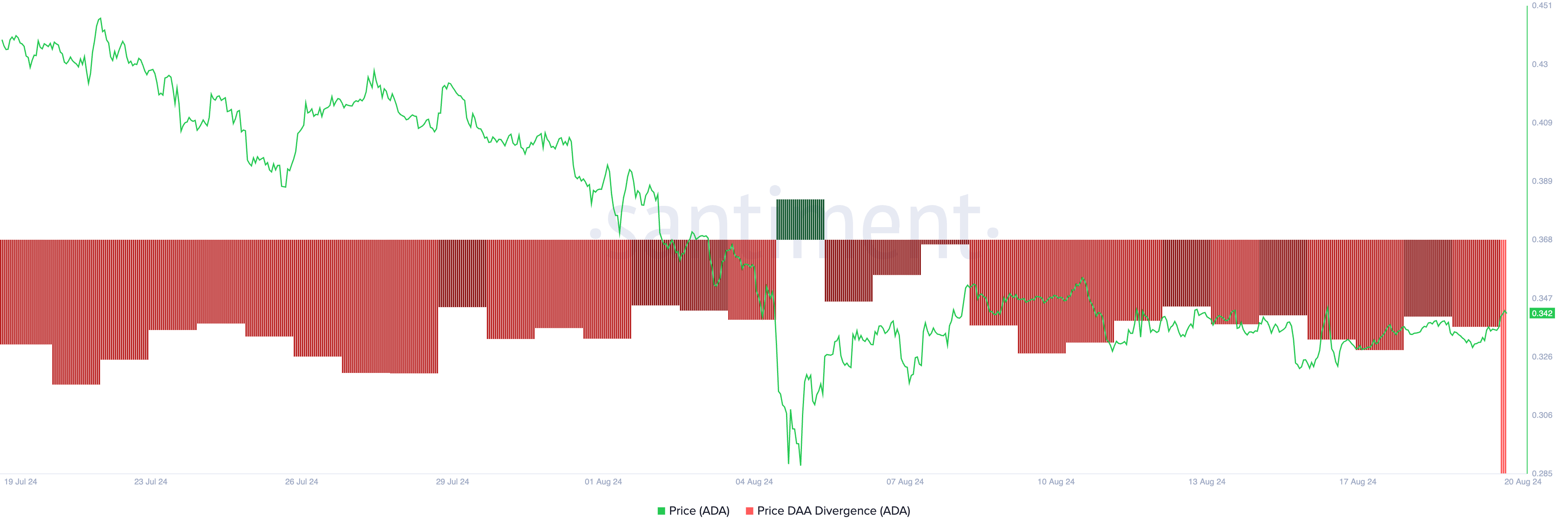 Under de senaste 24 timmarna har ADA:s pris ökat med 2%, medan dess pris-DAA-avvikelse minskat. Detta tyder på att endast ett litet antal unika adresser deltar i transaktioner i förhållande till priset. Handlare ser vanligtvis detta som en varning för spekulativ verksamhet eller manipulation av en begränsad grupp investerare.