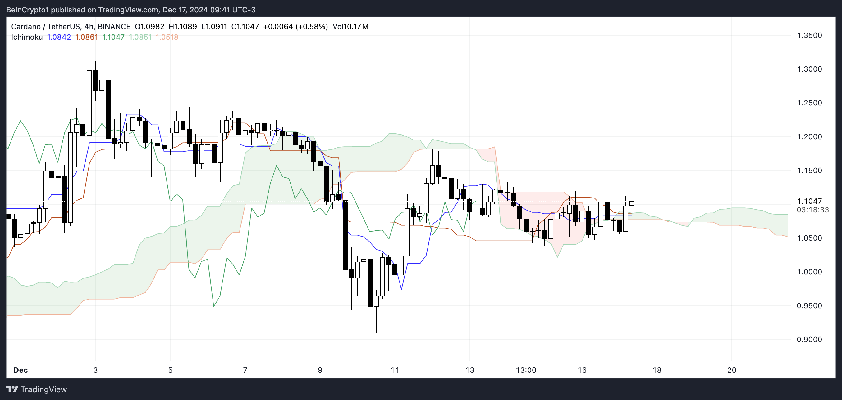 Chikou Span (grön linje) ligger efter priset och interagerar med senaste ljus, vilket signalerar att ADA fortfarande är i en konsolideringsfas.