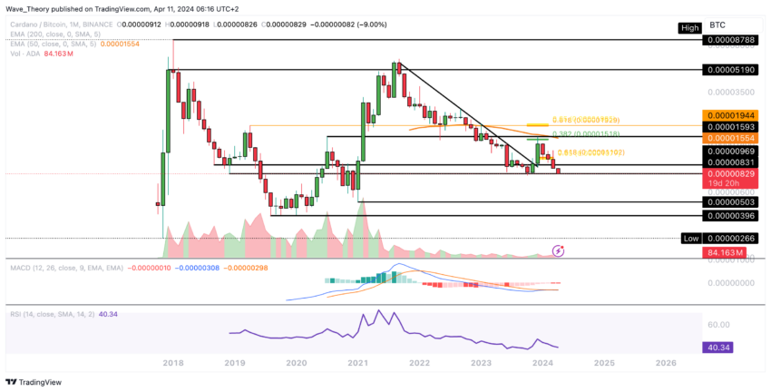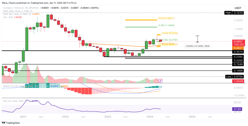 Förra månaden stod Cardano inför ett betydande hinder för att överträffa golden ratio-motståndet på cirka 0,86 USD. Därefter gick kryptovalutan in i en korrigerande fas, som verkar bestå in i den aktuella månaden.