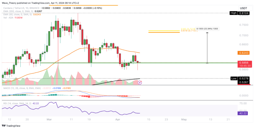Ett tänkbart scenario för ADA-priset innebär en hausseartad rebound från den nuvarande Fib-stödnivån på cirka 0.584 dollar. Cardano kan stiga upp mot det gyllene förhållandet på cirka 0.72 $ om detta materialiseras.
