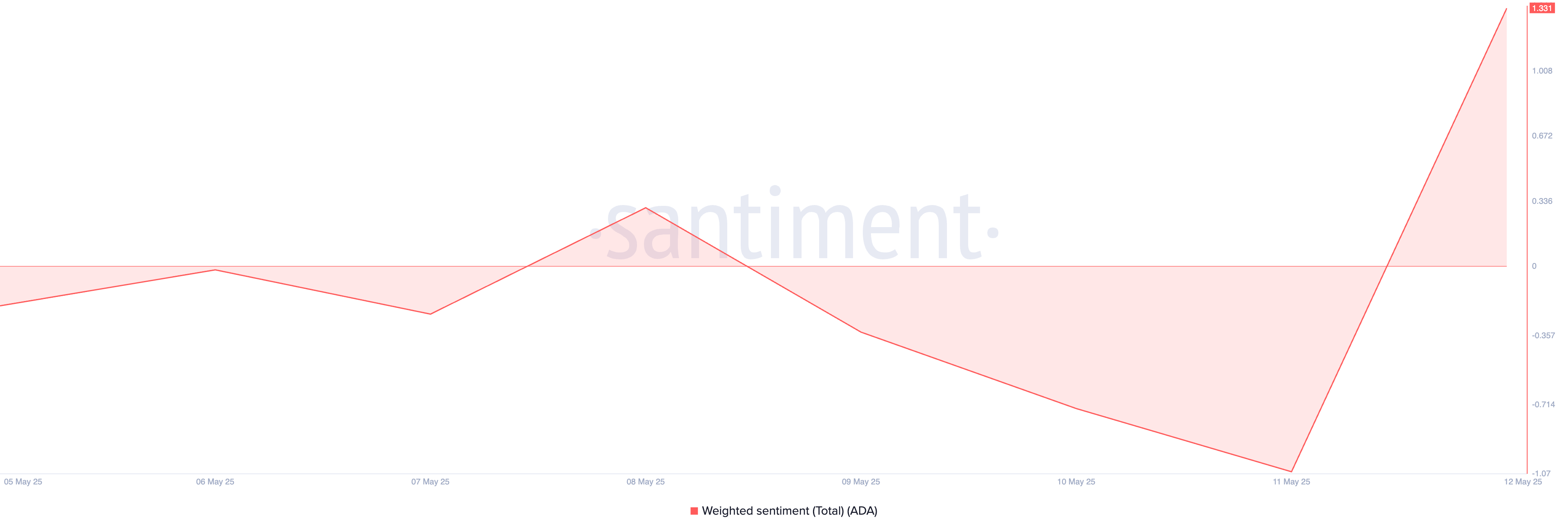 Investerarnas känsla kring ADA är fortfarande optimistisk. Enligt Santiment är myntets viktade känsla på 1,33 och i en uppåtgående trend just nu.