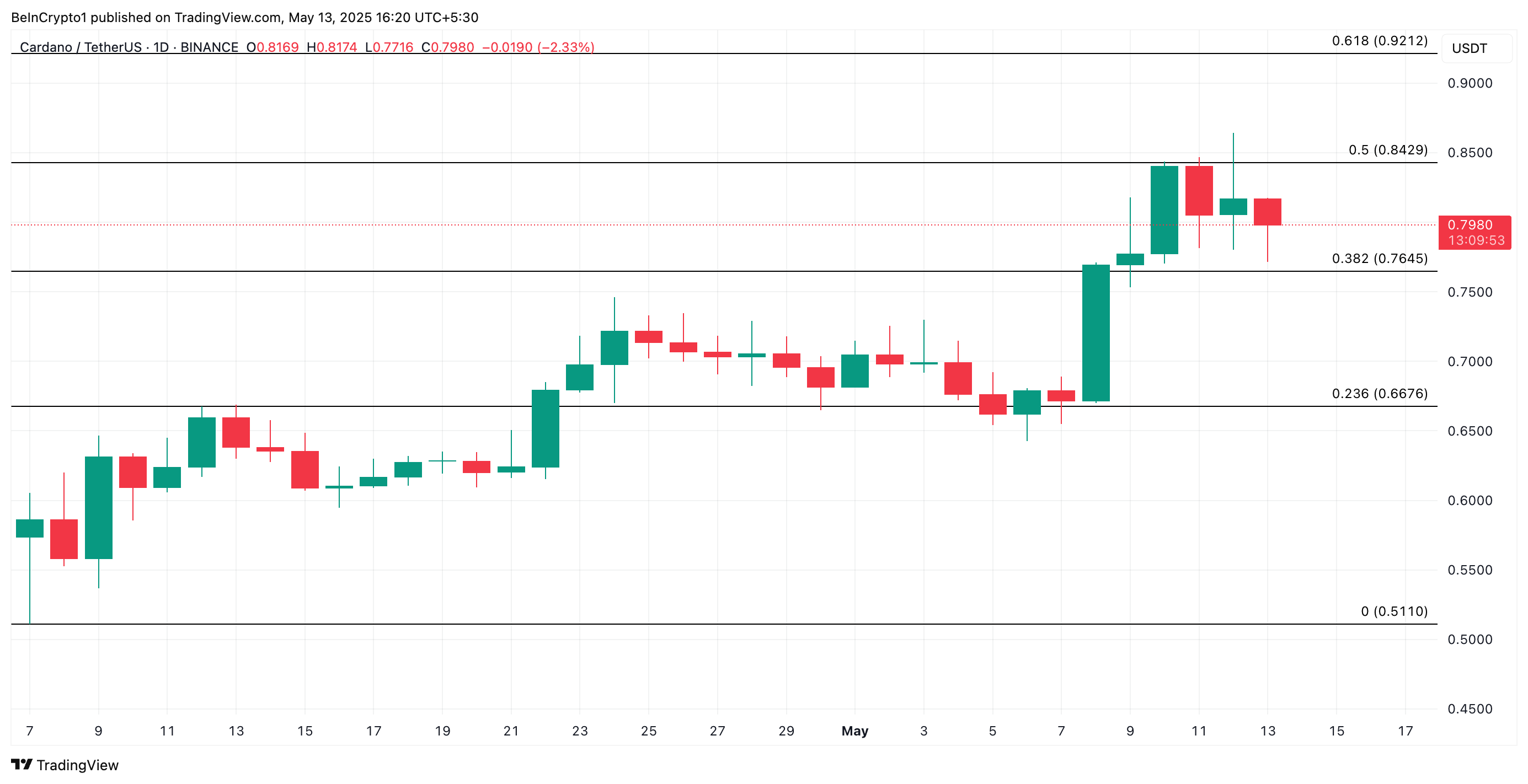 Avläsningar från det dagliga diagrammet visar att ADA har rört sig inom ett intervall sedan 10 maj. Under de senaste tre dagarna har altcoinet mött motstånd vid 0,84 USD och hittat stöd vid 0,76 USD.
