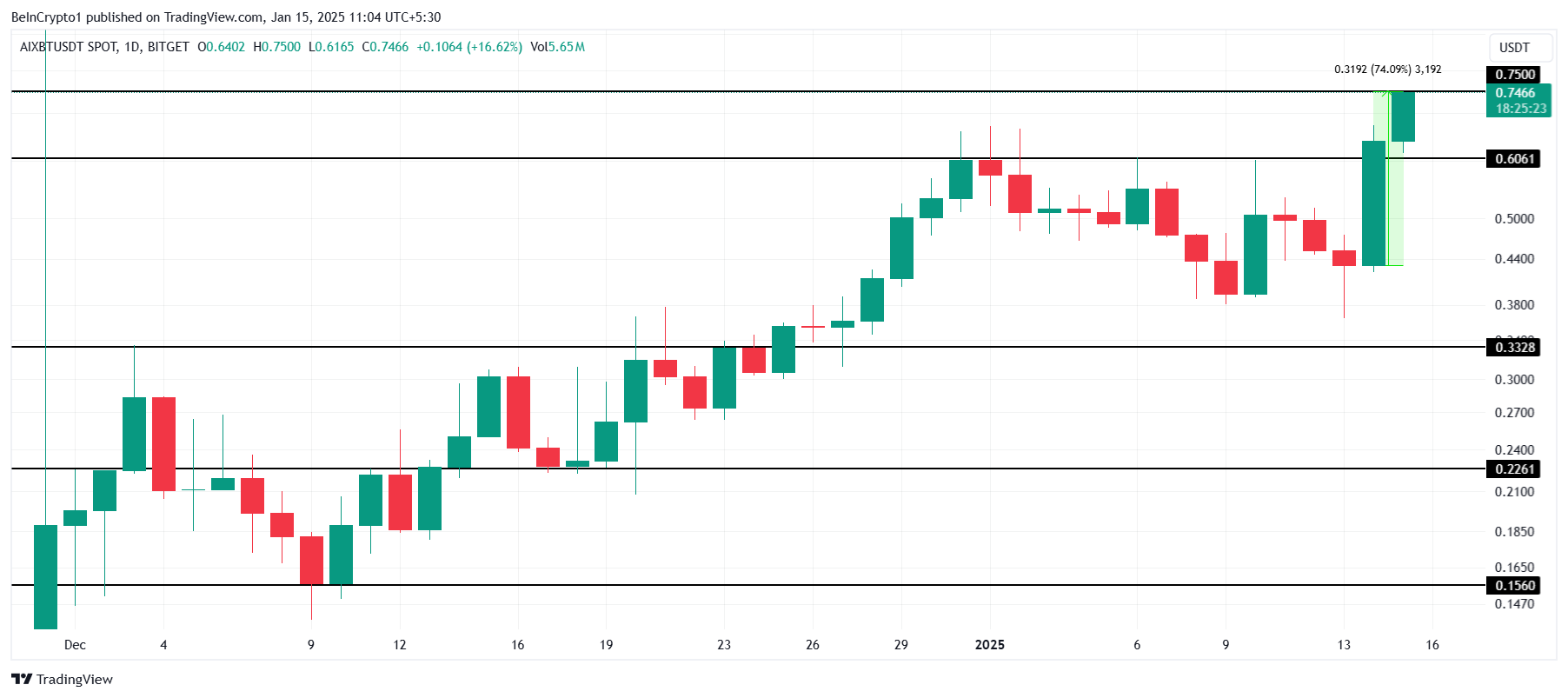 AIXBT:s pris steg med 74 % de senaste 24 timmarna, till 0,74 USD och nådde en ny rekordnivå på 0,75 USD. Denna ökning representerar en betydande återhämtning och stärker dess position som en toppresterande AI-driven altcoin.
