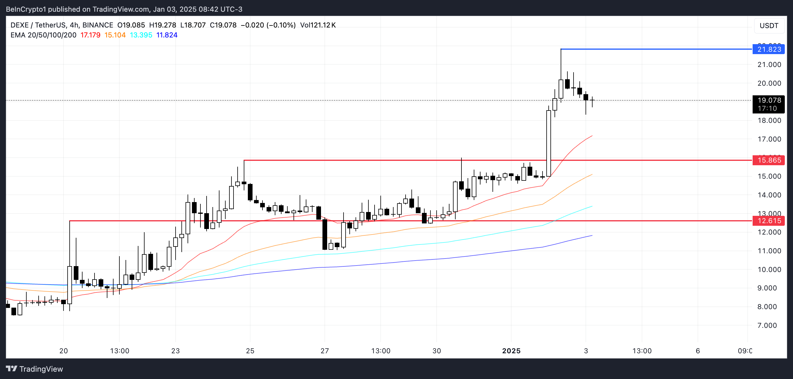 Om uppgången och hypen kring AI-mynt fortsätter, kan DEXE testa motståndet vid 21,8 USD, med en potentiell ökning till 25 USD om det bryts. Men om momentumet försvagas kan det falla till 15,8 USD i stöd, och ytterligare ner till 12,6 USD om nedgången fortsätter.