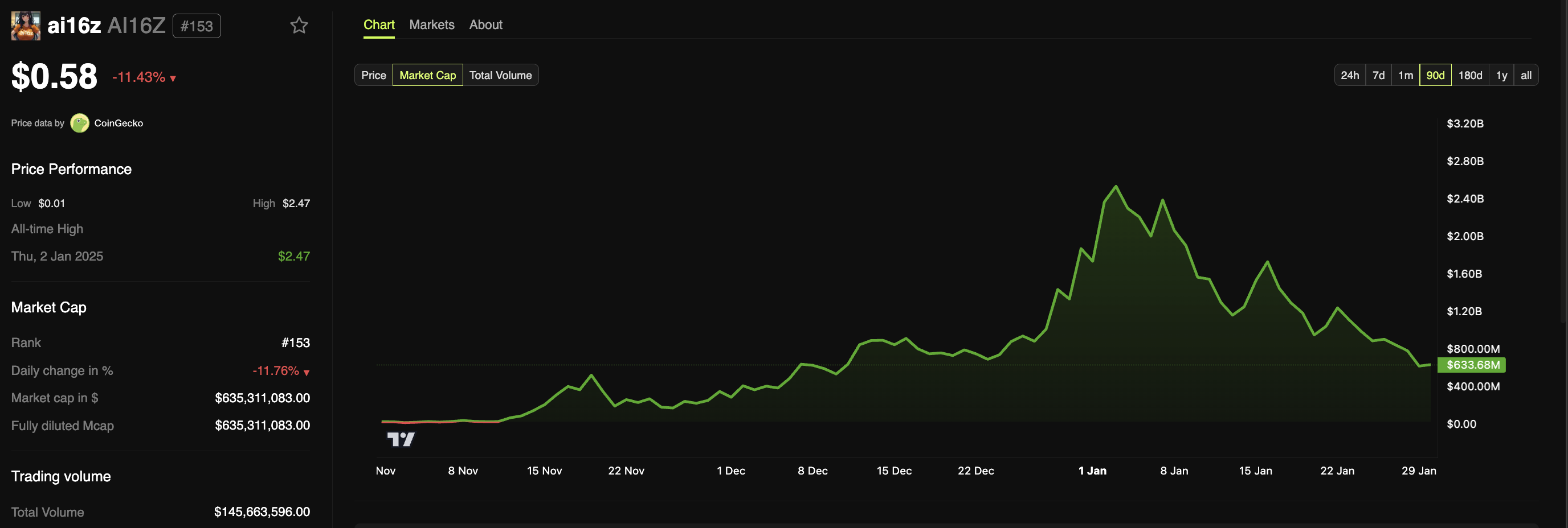 ai16z-tokenen upplevde nyligen en stor ökning efter att president Donald Trump tillkännagav en investering på 500 miljarder USD i privat AI-infrastruktur. Men i skrivande stund är den fortfarande cirka 75 % under sitt all-time high.