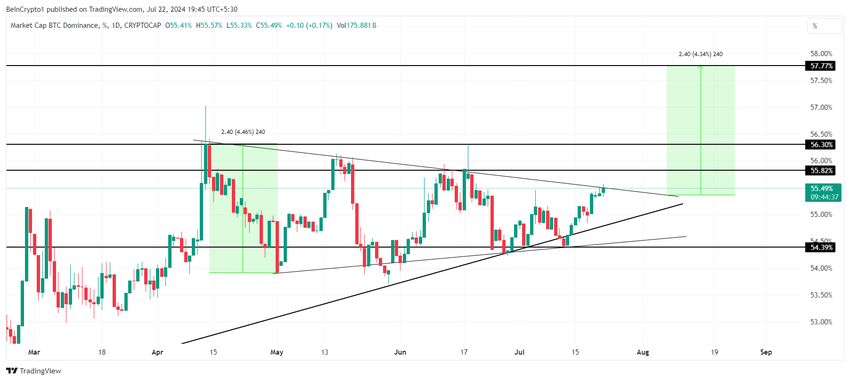 Bitcoins pris steg för att passera 68 000 dollar nyligen, vilket ledde till att dess dominans steg till 55,49%. Den senaste fluktuationen har resulterat i att BTC:s dominans bildar en symmetrisk triangel. Detta hausseartade fortsättningsmönster tyder på att en ökning med 4,34% är trolig, vilket kan föra Bitcoins dominans till 57%.