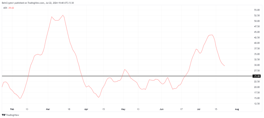 Altcoin-säsongen noterar en försening eftersom marknaden inte stöder en ökning av altcoins pris. Altcoin-marknadens uppåtgående trend visar tecken på att försvagas, vilket indikeras av Average Directional Index (ADX).