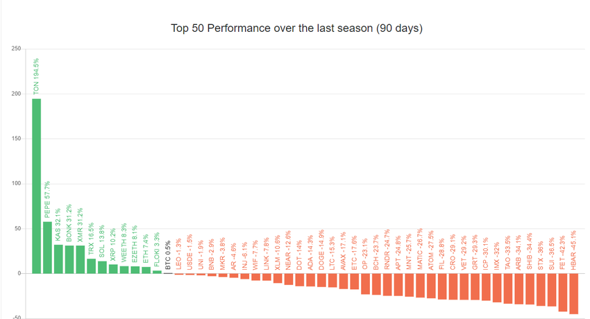 Under den senaste säsongen har de flesta tillgångar på altcoin-marknaden kämpat för att uppnå betydande tillväxt. Noterbart är att endast Toncoin och PEPE har lyckats registrera vinster på över 50%, vilket belyser deras exceptionella resultat mitt i en i stort sett stagnerande marknad.