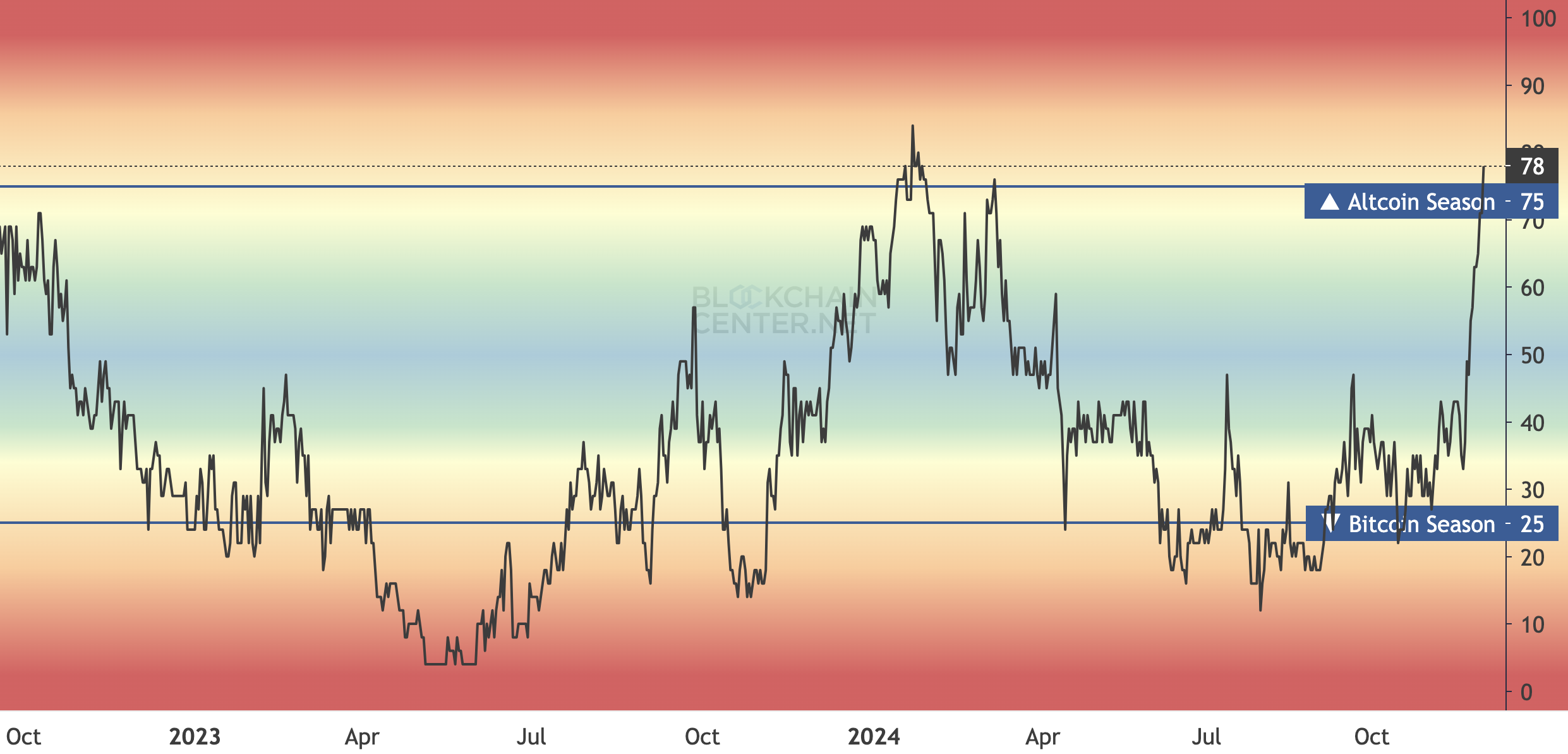 Å andra sidan, när altcoinsäsongsindexet når 75 eller högre, betyder det början på en altcoinsäsong. I detta fall presterar de flesta av de 50 främsta tillgångarna bättre än BTC. Just nu står indexet på 78, vilket bekräftar spekulationerna att altcoins kan fortsätta överträffa BTC de kommande månaderna.