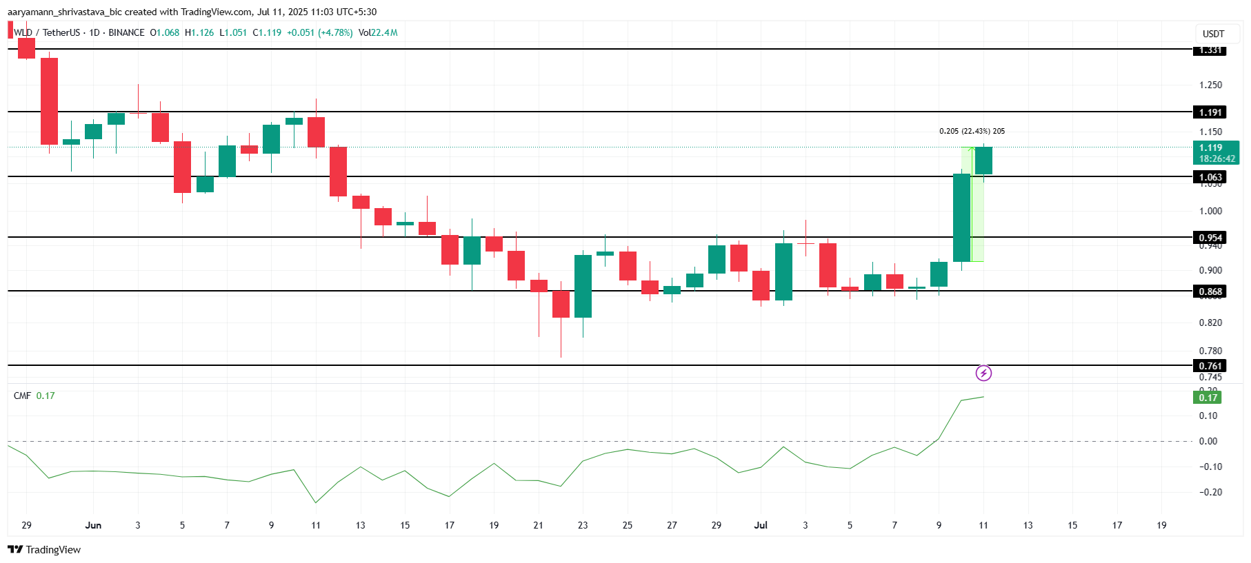 Nästa viktiga motståndsnivå för WLD är 1,19 USD, som altcoinet potentiellt kan bryta. De ökande inflödena, indikerade av ökningen i Chaikin Money Flow (CMF), tyder på att investerare alltmer satsar kapital i WLD. Att lyckas bryta 1,19 USD skulle sannolikt driva priset mot 1,33 USD, vilket markerar en betydande positiv rörelse.