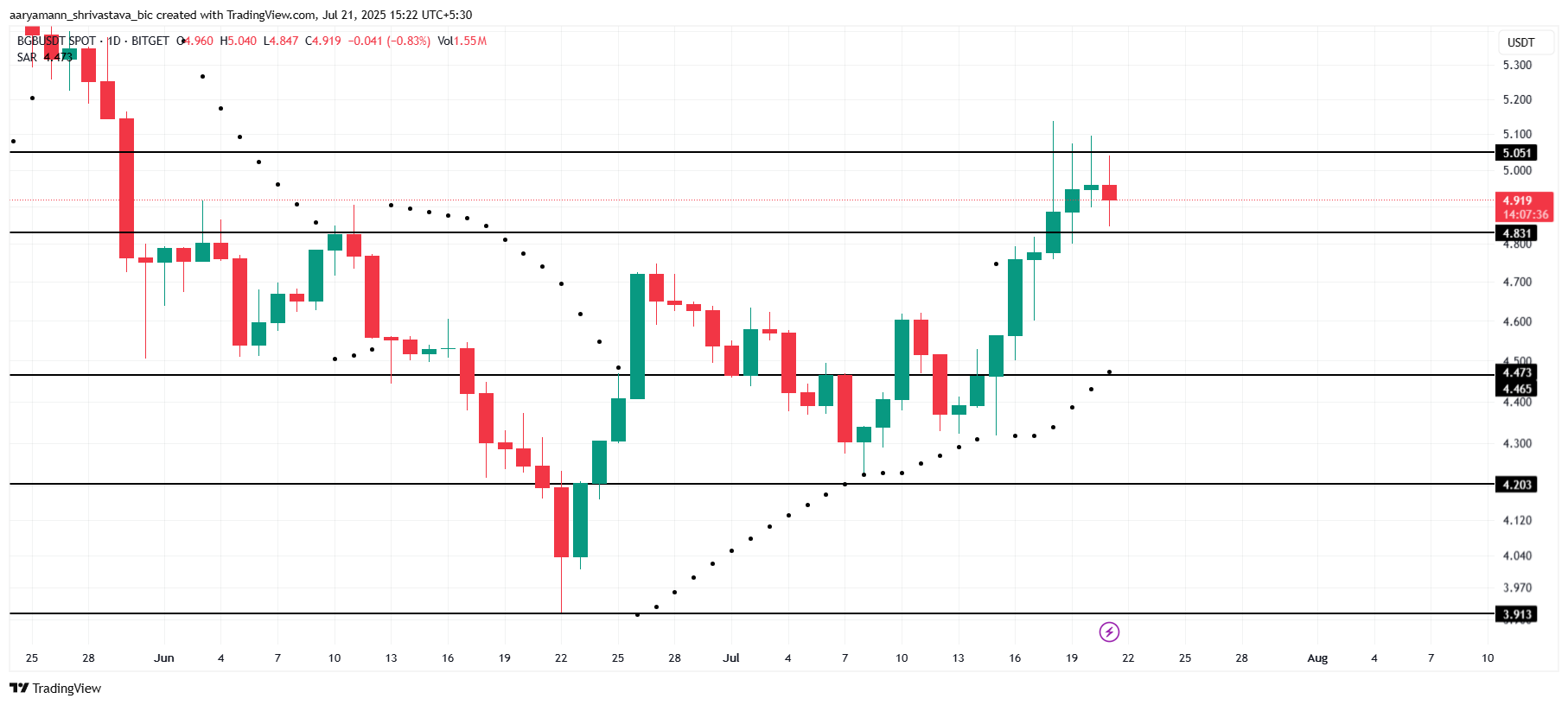 Om momentumet håller i sig kan altcoinet stiga över 5,05 USD, vilket hjälper Bitgets token att återhämta förluster som uppstod under marknadskorrigeringen i maj.