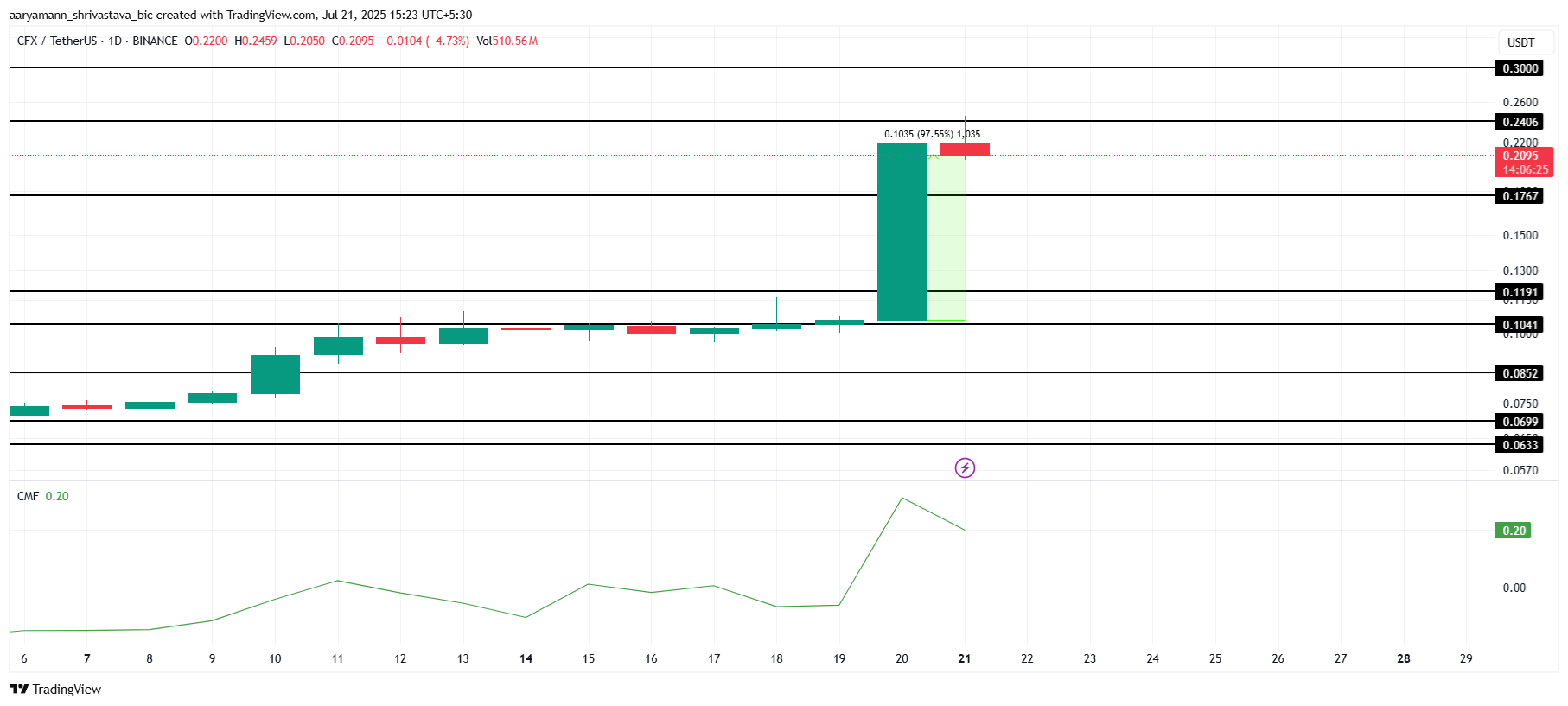 Spänningen fortsätter att växa när Conflux förbereder sig för sin 3,0-uppgradering, planerad till början av augusti. Denna stora milstolpe kan fungera som en positiv katalysator. Om CFX återhämtar sig från stödnivån på 0,17 USD kan altcoinet bryta 0,24 USD och potentiellt stiga mot den viktiga psykologiska nivån på 0,30 USD på kort sikt.