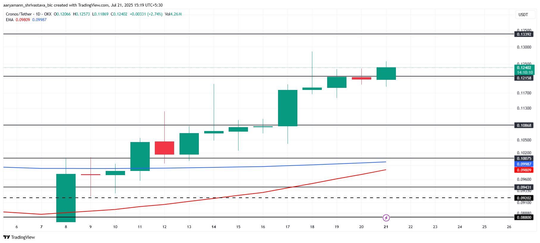 Men bredare marknadsförändringar kan utmana den positiva utsikten. Om det negativa momentumet ökar kan Cronos förlora sitt nuvarande stöd och falla till 0,108 USD. En sådan nedgång skulle upphäva den nuvarande positiva strukturen.