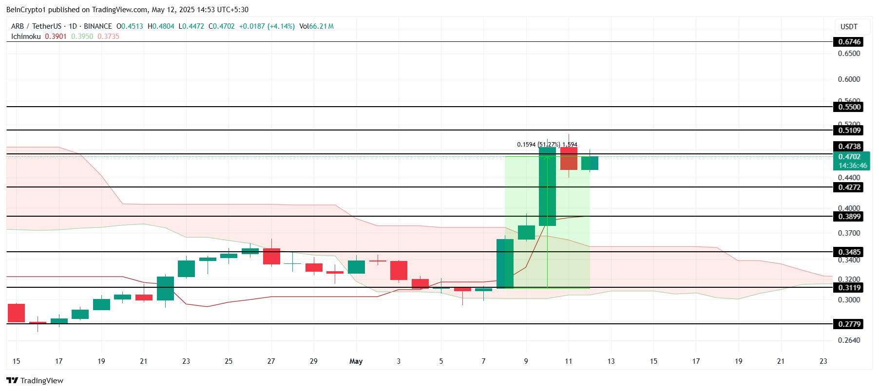 Innan tokens låses upp kan ARB uppleva ytterligare vinster. Ichimoku-molnet är för närvarande under ljusstakarna, vilket signalerar potentiell positiv momentum. Om detta momentum fortsätter kan ARB bryta 0,51 USD och gå mot 0,55 USD, med starkt köparstöd som potentiellt driver altcoinet högre på kort sikt.