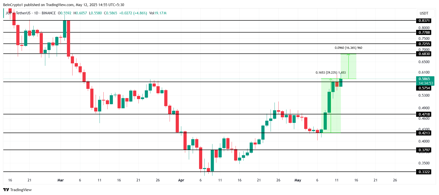 JUP har upplevt en nästan 40 % ökning de senaste dagarna och handlas nu till 0,58 USD. För att nå det viktiga motståndet på 0,68 USD behöver altcoinet en ytterligare ökning på 16 %. Den nuvarande momentumet visar potential, men att säkra 0,57 USD som stöd är nödvändigt för ytterligare vinster.