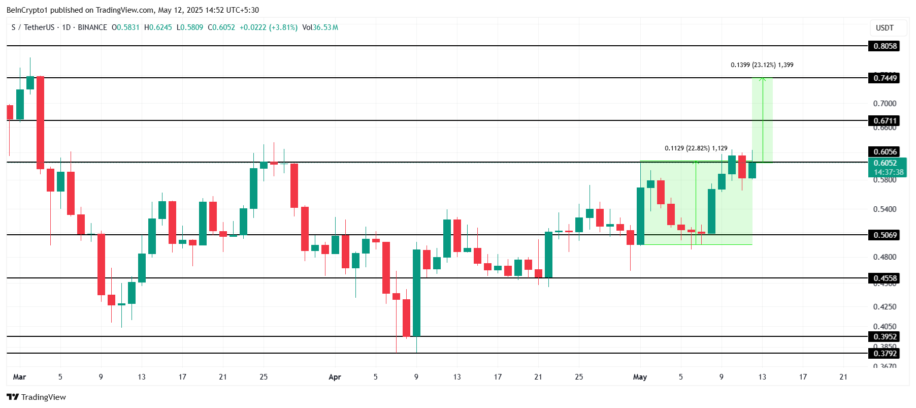 Den kommande Sharding-funktionen, som lanseras den 15 maj, kan spela en viktig roll i Sonics återhämtning. Denna uppgradering förväntas öka transaktionshastigheten och minska nätverksbelastningen, vilket kan driva altcoinet ytterligare uppåt. Om förbättringarna tar fart kan Sonic stiga till 0,74 USD och återhämta mars förluster.