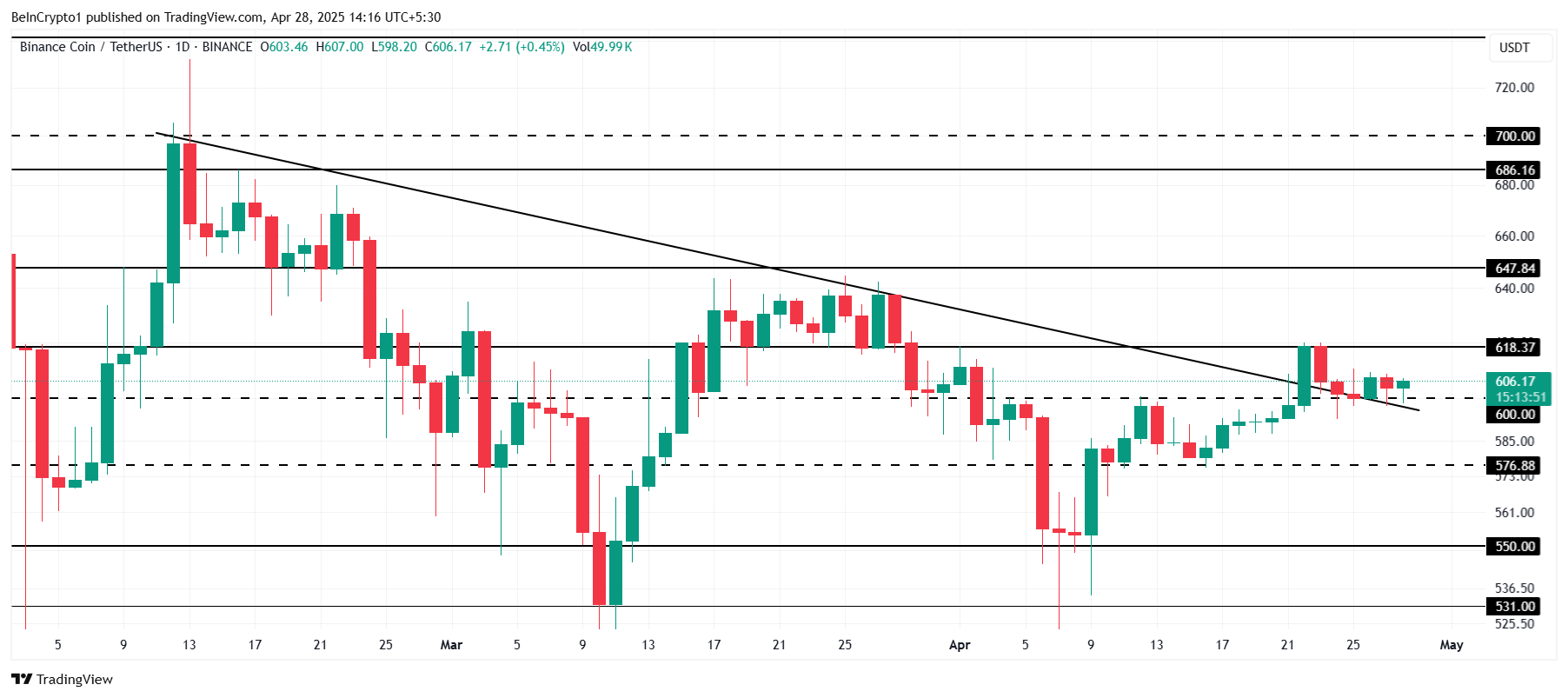 Om BNB misslyckas med att bryta motståndet vid 618 USD, kan en nedgång följa, vilket potentiellt sänker priset under 600 USD. I detta scenario kan BNB hitta stöd vid 576 USD, vilket skulle ogiltigförklara den positiva utsikten. Att övervaka nivån vid 618 USD blir avgörande för att bedöma altcoinets bana de kommande dagarna.