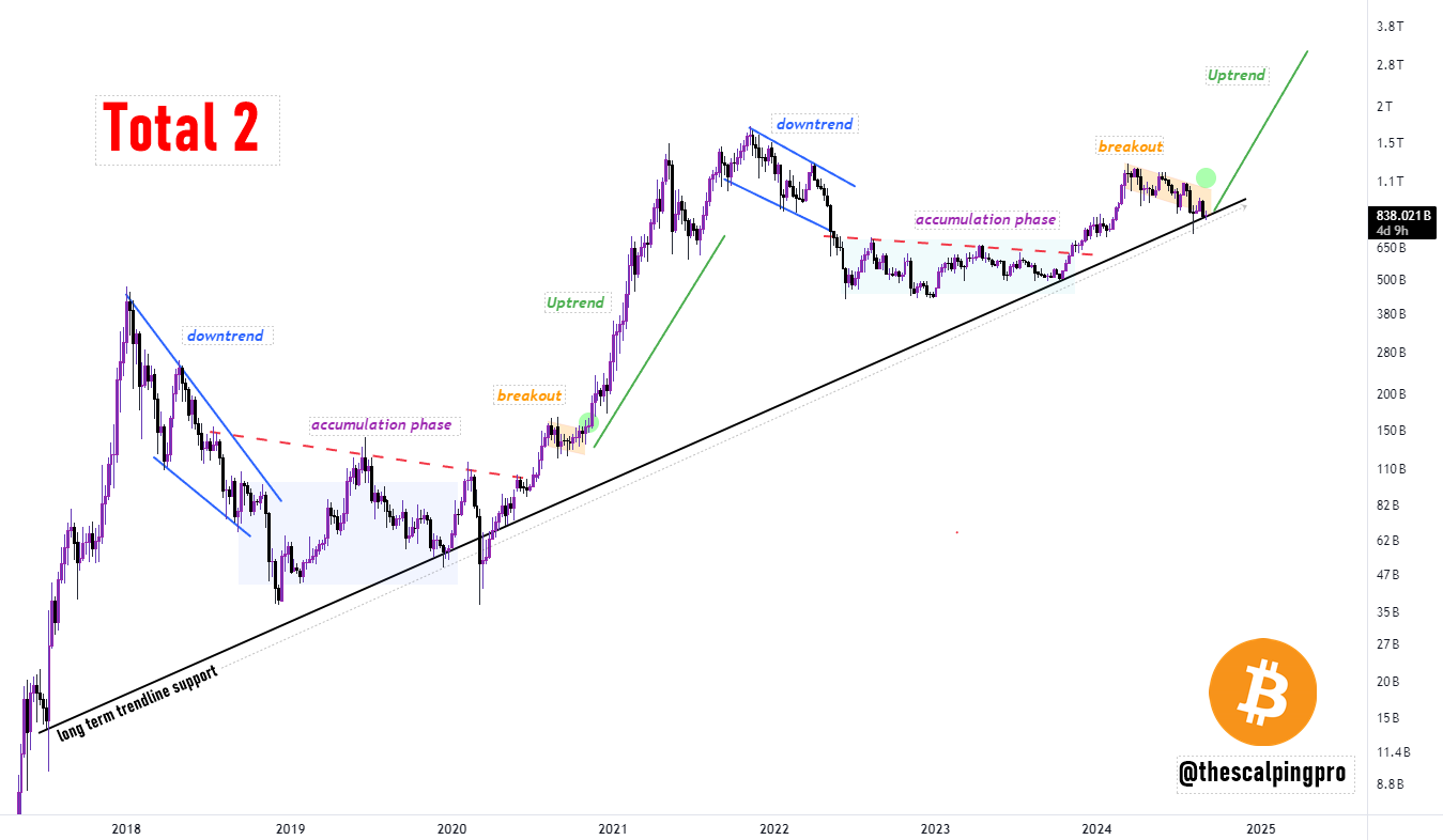 Mags, en framstående kryptoanalytiker, påpekar att altcoins handlas till 60% till 80% av sina tidigare toppar. Han framhäver att Total2, som spårar marknadsvärdet för de topp-125 kryptovalutorna exklusive Bitcoin, håller sig över en stigande trendlinje.