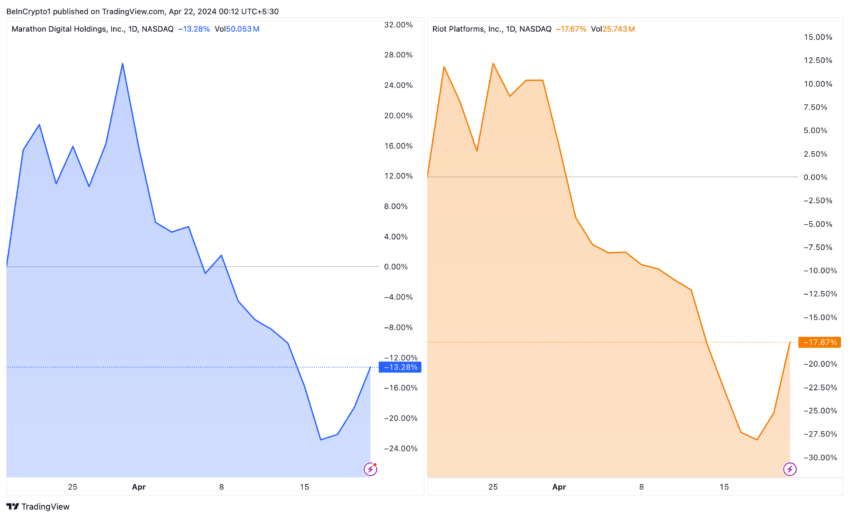 Den traditionella finanssektorn, i synnerhet Wall Street, togs på sängen av denna utveckling. Aktier som Marathon Digital Holdings (MARA) och Riot Platforms (RIOT) såg en nedgång på över 20 % under månaden som ledde fram till halveringen, och underskattade potentialen hos Runes och kryptomarknadens anpassningsförmåga.
