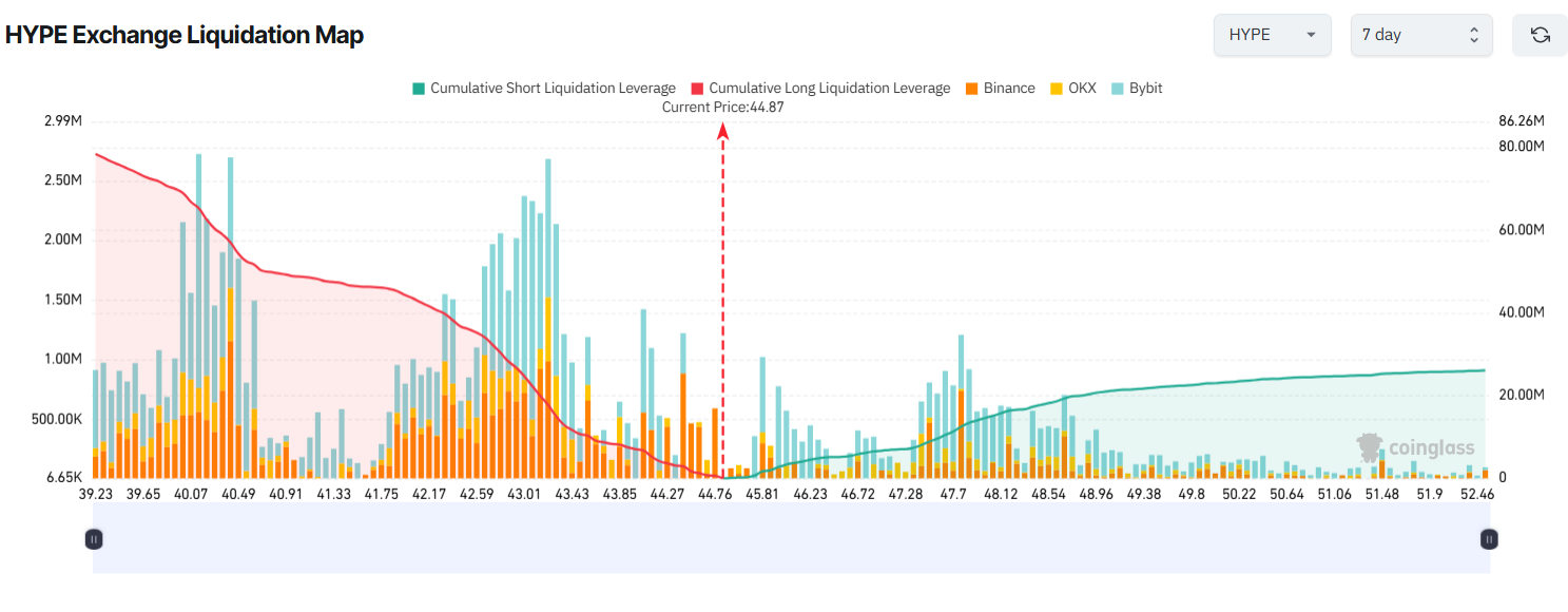 Om HYPE sjunker till 39 USD denna vecka, kan nästan 80 miljoner USD i långa positioner likvideras. Å andra sidan, ett utbrott över 50 USD kan likvidera cirka 24 miljoner USD i korta positioner.