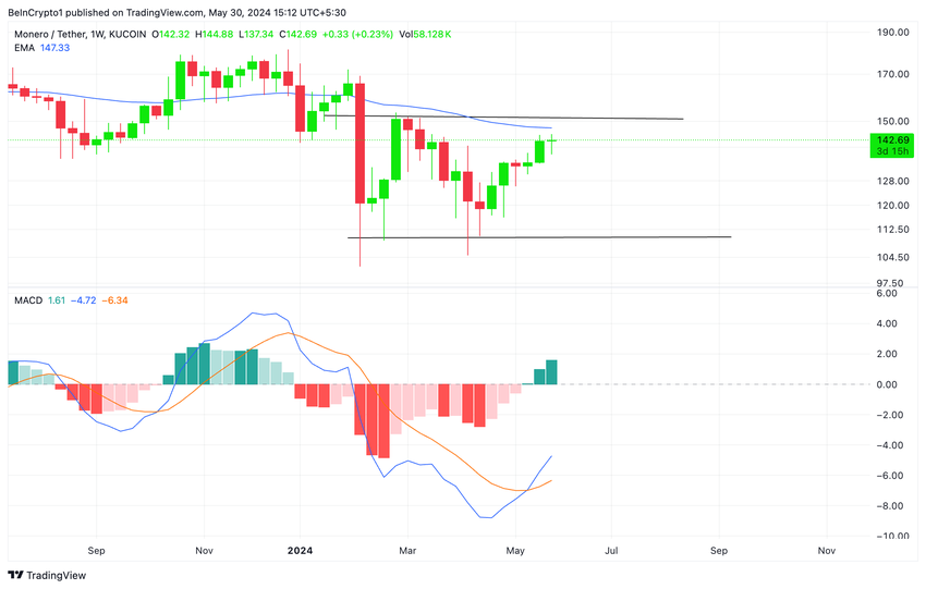 Som en bekräftelse på det ökade köptrycket visade avläsningarna från XMR:s MACD-indikator (Moving Average Convergence Divergence) att MACD-linjen (blå) nyligen passerade över signallinjen (orange).