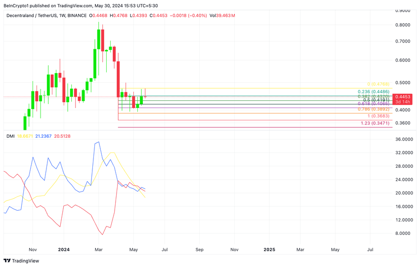 Bedömt på ett veckodiagram handlas Decentraland (MANA) för närvarande nära den övre linjen i den horisontella kanalen, som den har trendat inom sedan 8 april.