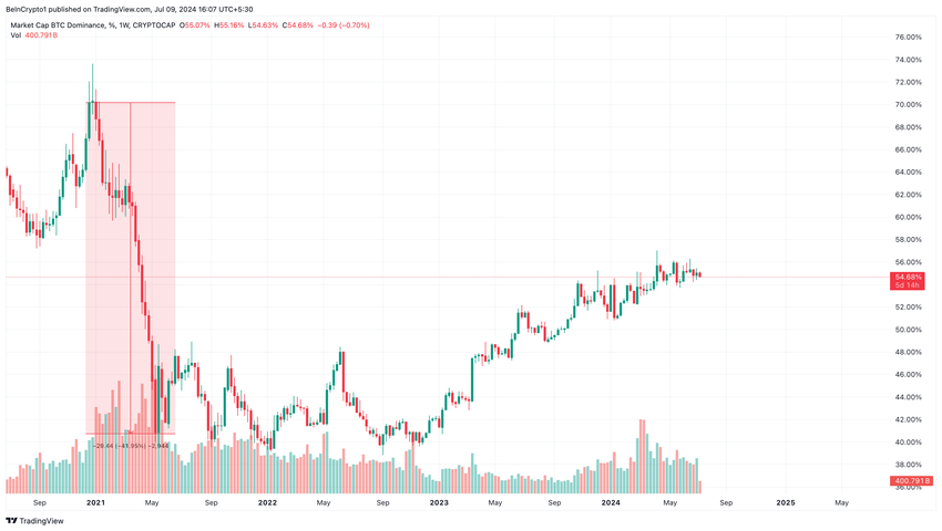 Den här veckan har dominansen sjunkit från 55,04% till 54,68%, vilket indikerar att vissa altcoins har börjat överträffa BTC.